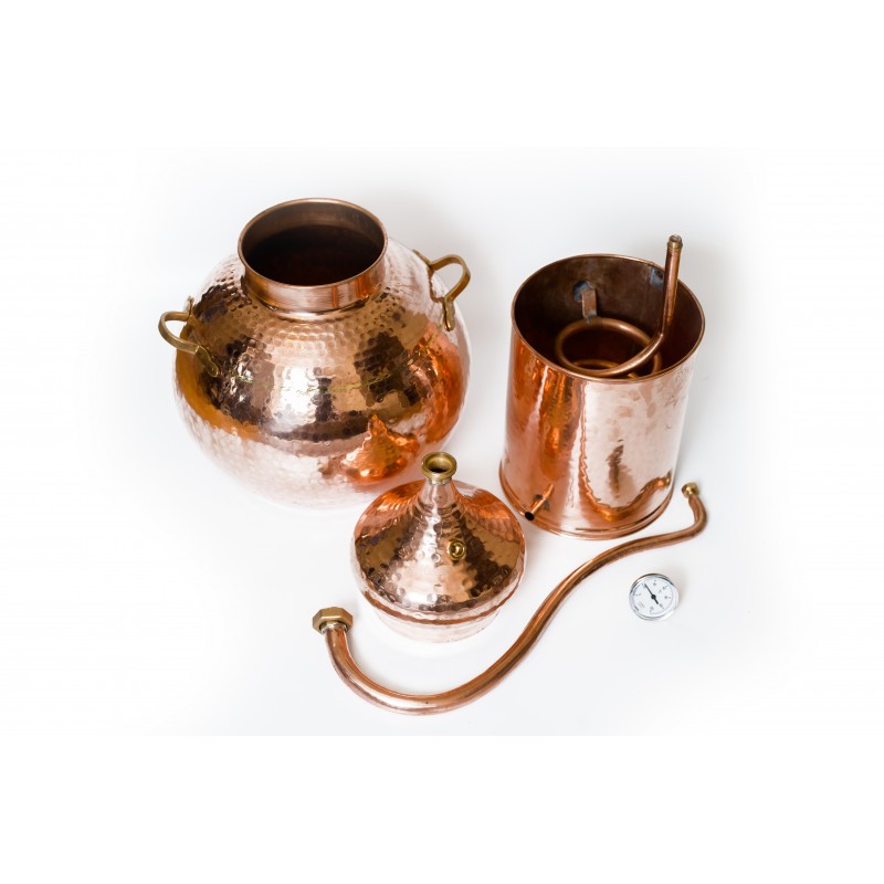 Klasický destilační přístroj určený k výrobě ovocných a obilných destilátů doma. Pouze alembik umožní získat kvalitní produkt s aromatickými tóny vstupní suroviny. I cukrový alkohol bude mít jemnější chuť a vůni. Zcela vyroben z vysoce kvalitní mědi o síle 0,9 mm v Portugalsku. To je opravdu evropská kvalita.